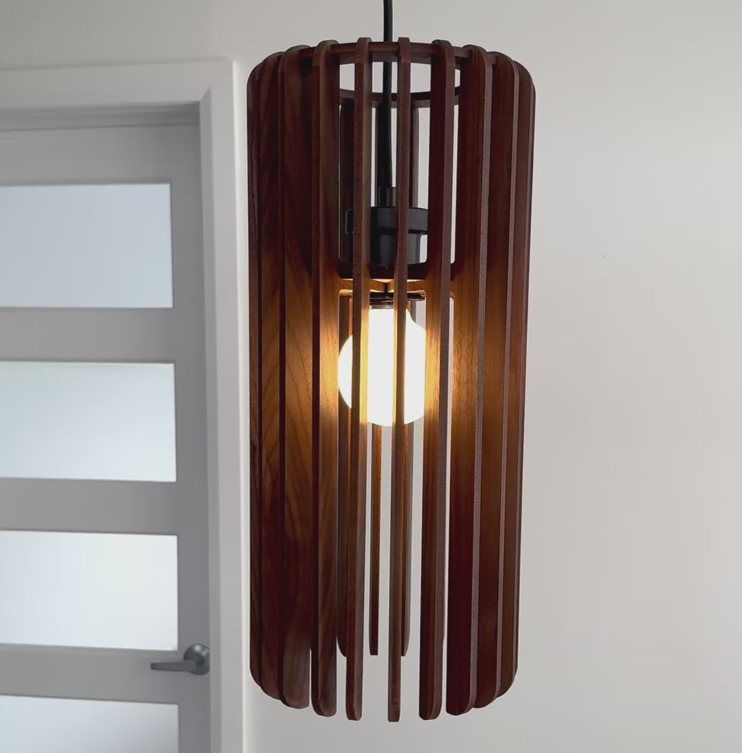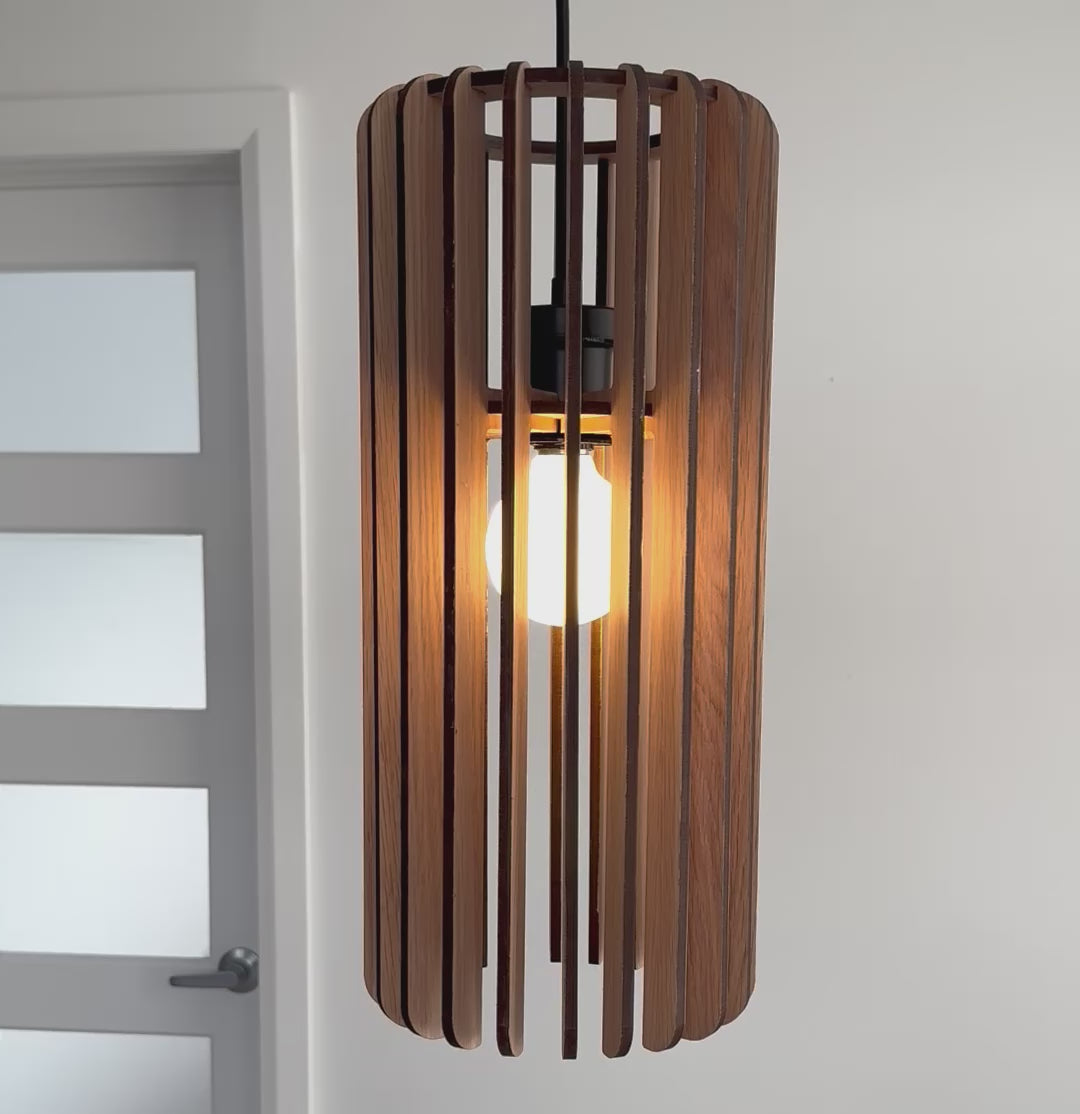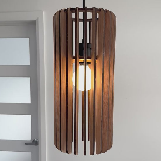 Measuring 8" wide by 18" high, this pendant lamp casts a warm, layered glow that transforms any space. Available in White Oak or Walnut, it brings an architectural presence and the warmth of natural materials to your home.