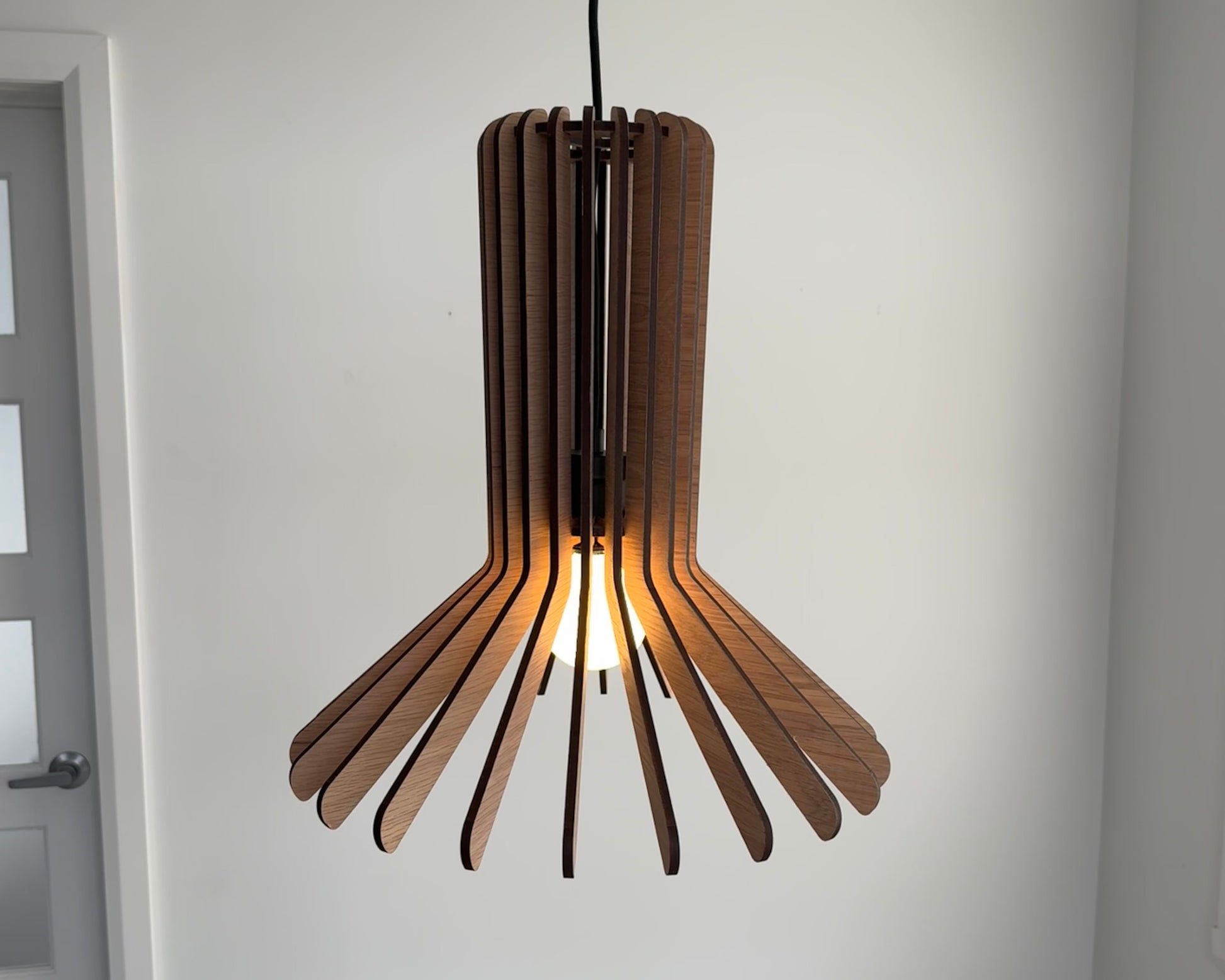 Crafted from laser-cut slats, hand-assembled with precision into a form inspired by traditional lamp shades. Each slat curves gracefully outward from an 8" top to a 17" base, creating a sculptural silhouette that reimagines classic design through contemporary craftsmanship.