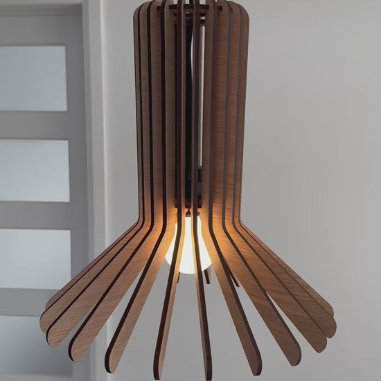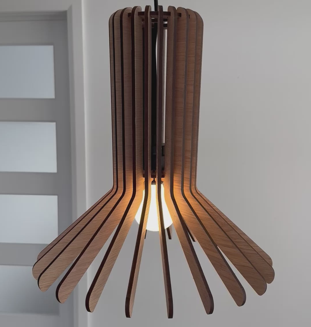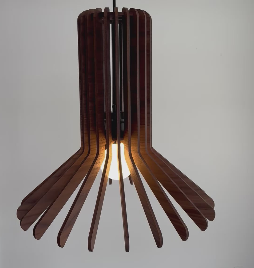 Measuring 17" wide by 18" high, this pendant casts a warm, layered glow that transforms any space. Available in White Oak or Walnut, it brings an architectural presence and the warmth of natural materials to your home.